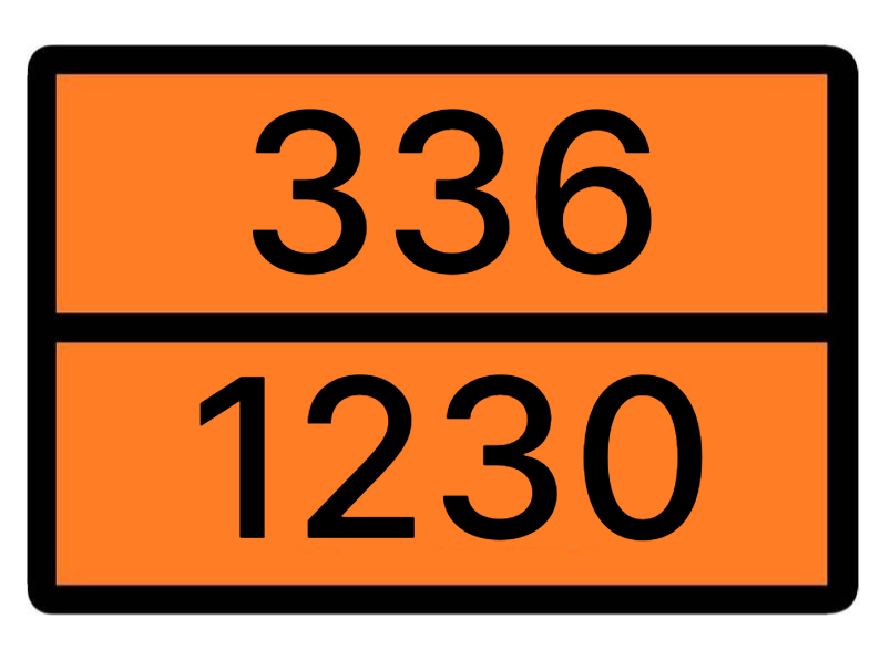 Код опасности 336 — 3 (легковоспламеняющаяся жидкость), 3 (способность гореть интенсивно), 6 (токсичность). Легковоспламеняющаяся, токсичная жидкость.